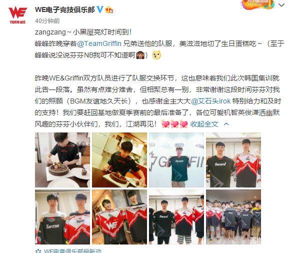 昨晚WE&Griffin双方队员进行了队服交换环节,这也意味着我们此次韩国集训就此告一段落。虽然有点难分难舍,但相聚总有一别,非常谢谢这段时间芬芬对我们的照顾(BGM友谊地久天长),也感谢金主大大@艾石头irok特别给力和及时的支持!我们要赶回基地做夏季赛前的最后准备了,各位可爱机智英俊潇洒幽默风趣的芬芬小伙伴们,我们,江湖再见!