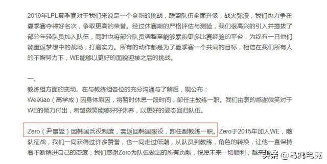 在近日,WE战队官方发布的一则公告中,表示因为要服兵役,Zero要离开WE战队,并卸任副教练一职。