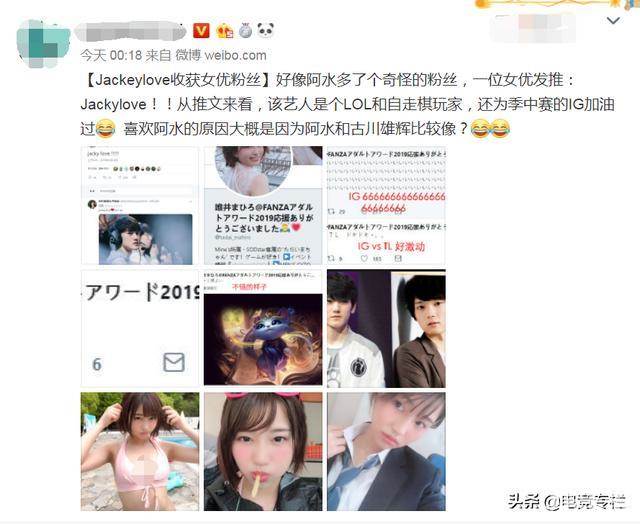曝光的消息中称,阿水好像多了个奇怪的粉丝,为什么要用奇怪形容呢?细细看下去阿水是多了一位女优粉丝,该演员是一个自走棋和LOL玩家,从她发出的推文中,发现在季中赛的时候,为IG加油过!发文内容是:“Jackylove!”当然据传喜欢阿水的原因,是因为长相和古川雄辉比较像,其实这只能说是一种猜测,她喜欢阿水更多的原因,或许是因为阿水优秀的操作,毕竟在电子竞技中,实力才是大众所追捧的点!