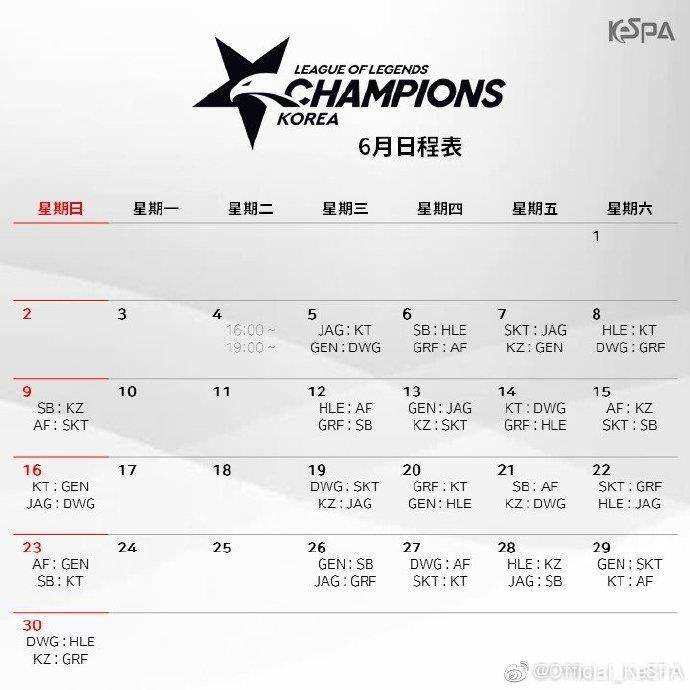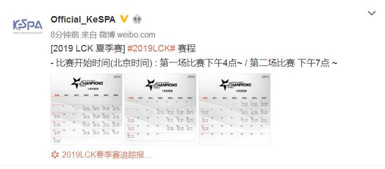 今日,Official_KeSPA在微博公布了2019LCK夏季赛赛程,揭幕战KT对阵JAG,Pray或回归首秀。以下是微博原文: