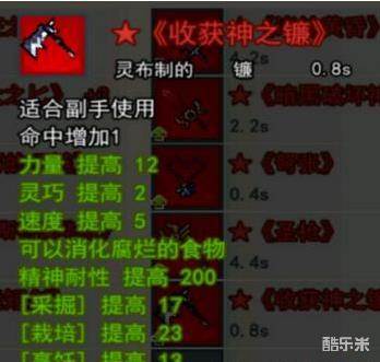 三阶段神器《收获神之镰》,虽然多个效果都倾向于生活辅助,实际上作为武器威力不小,因为这把镰刀的“斩首”触发率很高,有时甚至能达到秒杀的效果(当然还得看你属性