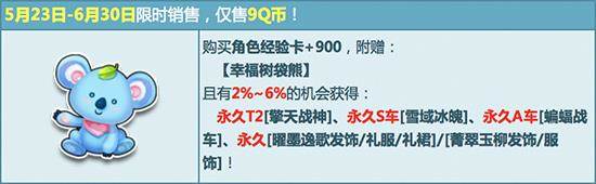 5月23日-6月30日,在飞车商城购买【角色经验卡+900】,赠送【幸福树袋熊】,有机会获得永久T2【擎天战神】、永久S车【雪域冰魄】、永久A车【蝙蝠战车】、永久【曜墨逸歌发饰/礼服/礼裙】/【菁翠玉柳发饰/服饰】或其他奖励之一!其中核心极品期限型概率范围为:4%-6%,核心奖励永久型概率范围为:2%-4%,非核心奖励概率范围为:90%-94%。