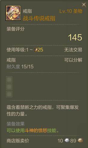 在饰品装备栏星级达到40级后,可以获得奖励【战斗传说戒指】,佩戴上该戒指,可立即获得技能伤害量 +1.5%,战斗熟练 +430,精准 +340效果,此外,还可发动专属技能【斗神的愤怒】,使用技能后可以增加PVP技能伤害量7%,持续时间为3分钟。