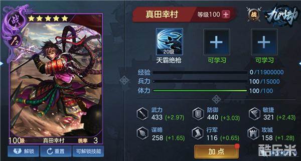 在游戏中,真田幸村是一个五星枪兵武将,拥有“天霸绝枪”技能,能让真田幸村打出额外连击,并且触发铁壁效果免疫伤害。
