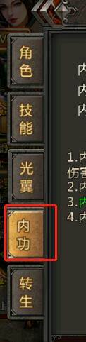 玩家可在游戏主界面点击菜单按钮进入角色系统,在角色系统中就可以看到内功页签。