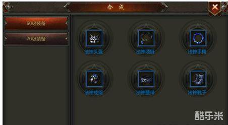 玩家可于主界面下方的操作进入装备合成系统,在这里玩家可以合成60-70级装备、神装、首饰、热血装备。