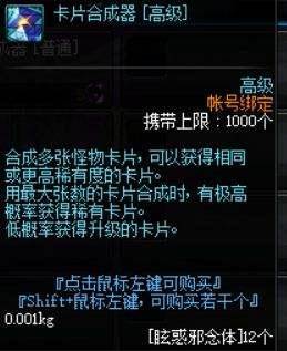 因为每个账号最多5个角色参与眩惑之塔,也就是每周最多可以领取15样道具,其中装备就不多说了,只适合搬砖小号使用;卡片礼袋虽然是随机抽取任何卡片,但是蓝白的几率在99%以上;剩下的就只有紫卡、粉卡和合成器了。