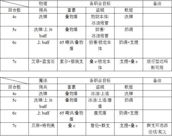 优势为buff量需求比物理低,难点则是歌姬需要专门带叠c卡牌,和盗贼需要在磨盾之后上群支