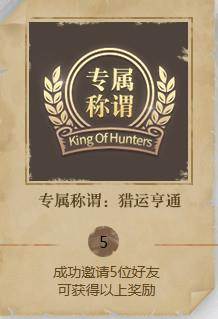 空有一身冷兵器的好武艺,却没有相应的好头衔?“专属称谓:猎运亨通”的奖励对于实力超群的你来说,绝对不能错过。开局就有闪亮的标记,对手必定不敢轻易怠慢。而与发挥100%实力的对手酣战一场,才是真英雄对自己最大的尊重!只需要成功邀请五位好友,猎手就能将专属称谓收入囊中了!