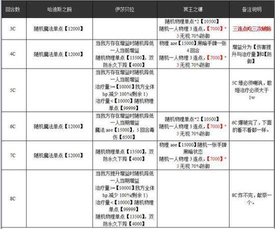 打法概述:这个BOSS的高危回合是在4C和6C比较容易减员,所以要尽可能度过4C,度过后5C歌姬只需要奶1W血即可,不需要奶满(反正当回合过后HP都会为1),富豪在5C嘲讽,防止BOSS清了佣兵和盗贼的BUFF。6C进行爆破,如果炸不死尽可能双破,歌姬奶满。