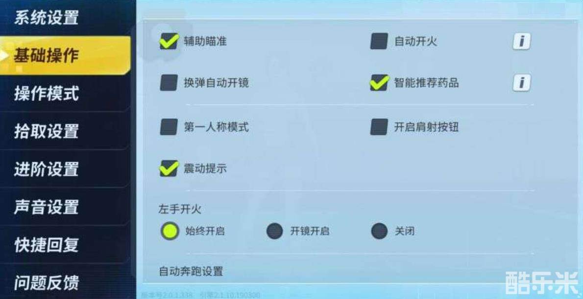 打开系统设置,在基础操作界面打开“辅助瞄准”和“自动开火”两个设置。如果小伙伴还没有打开快点去改改噢,因为这两个设置无论是手残或者大神都非常适用。