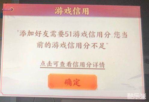 许多玩家的信用分不够,导致没办法加好友。出现提示框,添加好友需要51游戏信用分,您当前的游戏信用分不足。