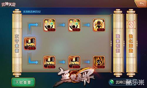 玩家在《无双飞将》的系统中找到“武神”,打开卷轴的武神天赋,三种不同的天赋按等级一一打开,最终走向王者天灯。