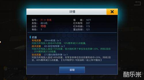 当然,在战斗表现方面,歼-31搭配的常规武器30mm机炮对敌方所有敌人造成40%伤害,战术武器KD-88空地导弹对敌方所有单位造成115%伤害,并提高我方随机两架战机攻击输出+20%,终极武器LT-3激光制导炸弹,合击效果对敌方所有单位造成149%伤害,友军攻击伤害和命中属性+20%。如果要打造一支以输出伤害为主、以凶猛的攻势压倒敌方的王牌编队,除了歼-20、歼-31绝对是不可或缺的首选战机。