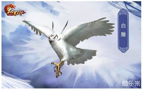 雕是武侠世界中翱翔于天空的霸主,它集各种优点于一身——白羽坚硬如铁,通人性,性情凶猛,不惧虎狼。一旦被驯服,将对主人忠心不二,可救主于危难之中。这一只生于北国的珍稀禽鸟,将护卫着掌门,肆意闯荡江湖。