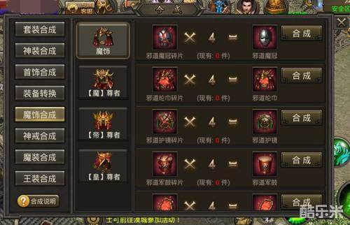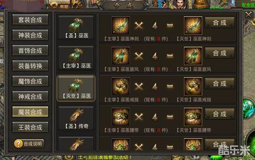 想要合成装备自然要找龙城里的能工巧匠,这里有专门的“装备合成”NPC。目前,这里共有套装、神装、首饰、装备转换、魔饰、神戒、魔装、王装8项可使用的功能。可谓是种类相当繁多了。其中,装备转换是专门用于装备适用性别的改变,比较特殊,其它都是用于提升装备战力值的。前期70级普通套装合成只需用3件任意60级装备就可以,合成后的瘟疫套装帮助不少勇士们都平稳走过了前中期过渡阶段。另外,饰品类(魔饰、首饰)狂战套装与战圣套装的合成先需要通过收集相应碎片,基本都是4合1,勇士们快去转生神殿、跨服深渊和轮回秘境去获得吧!