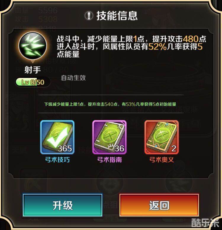 被动技能:射手。 满级情况下减少7点能量上限,提升3600点伤害,且有70%的概率风队友获得5点能量。 被动没啥可说的,基本配置,回能倒是不错的,只作用于风队中。