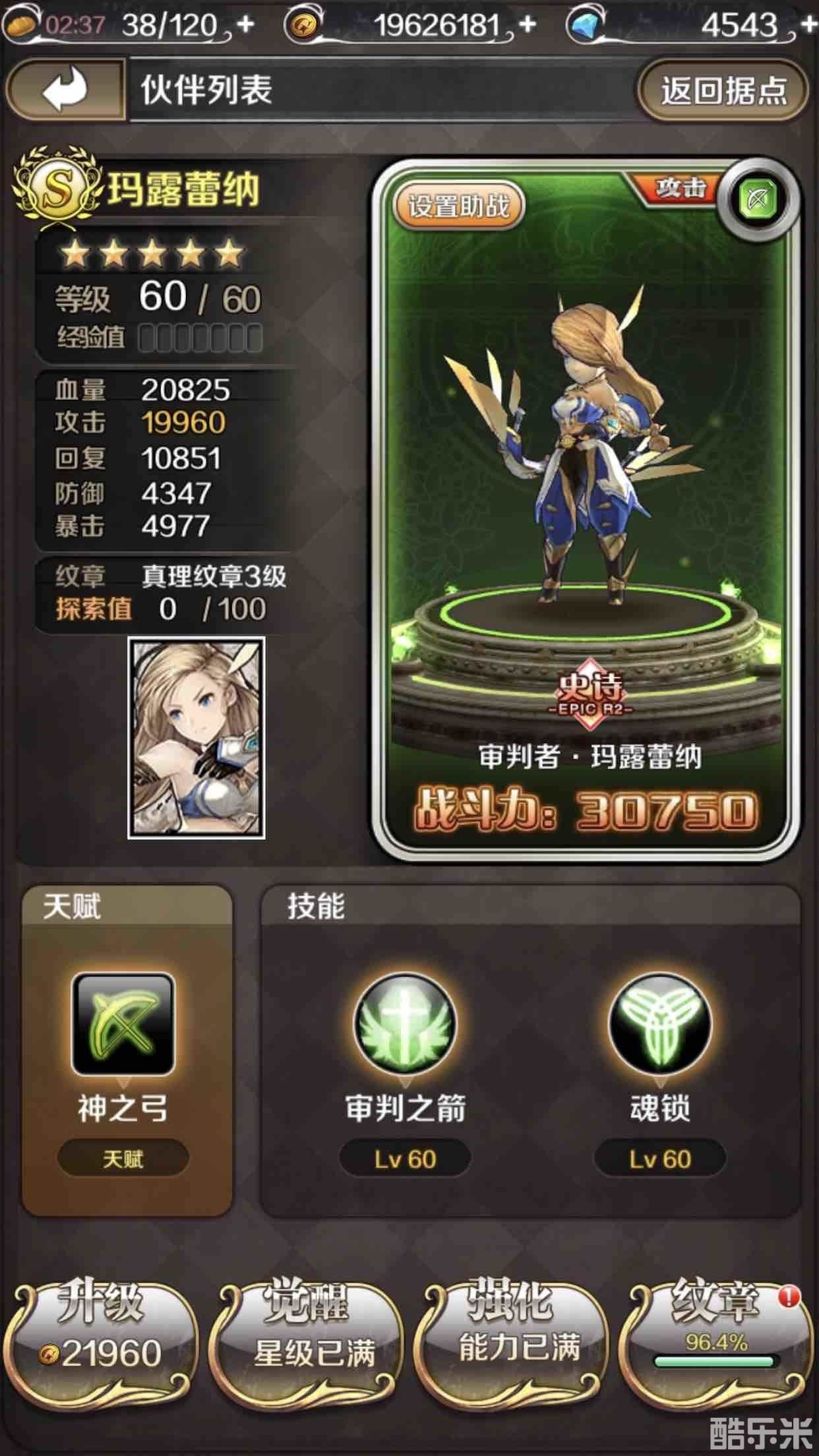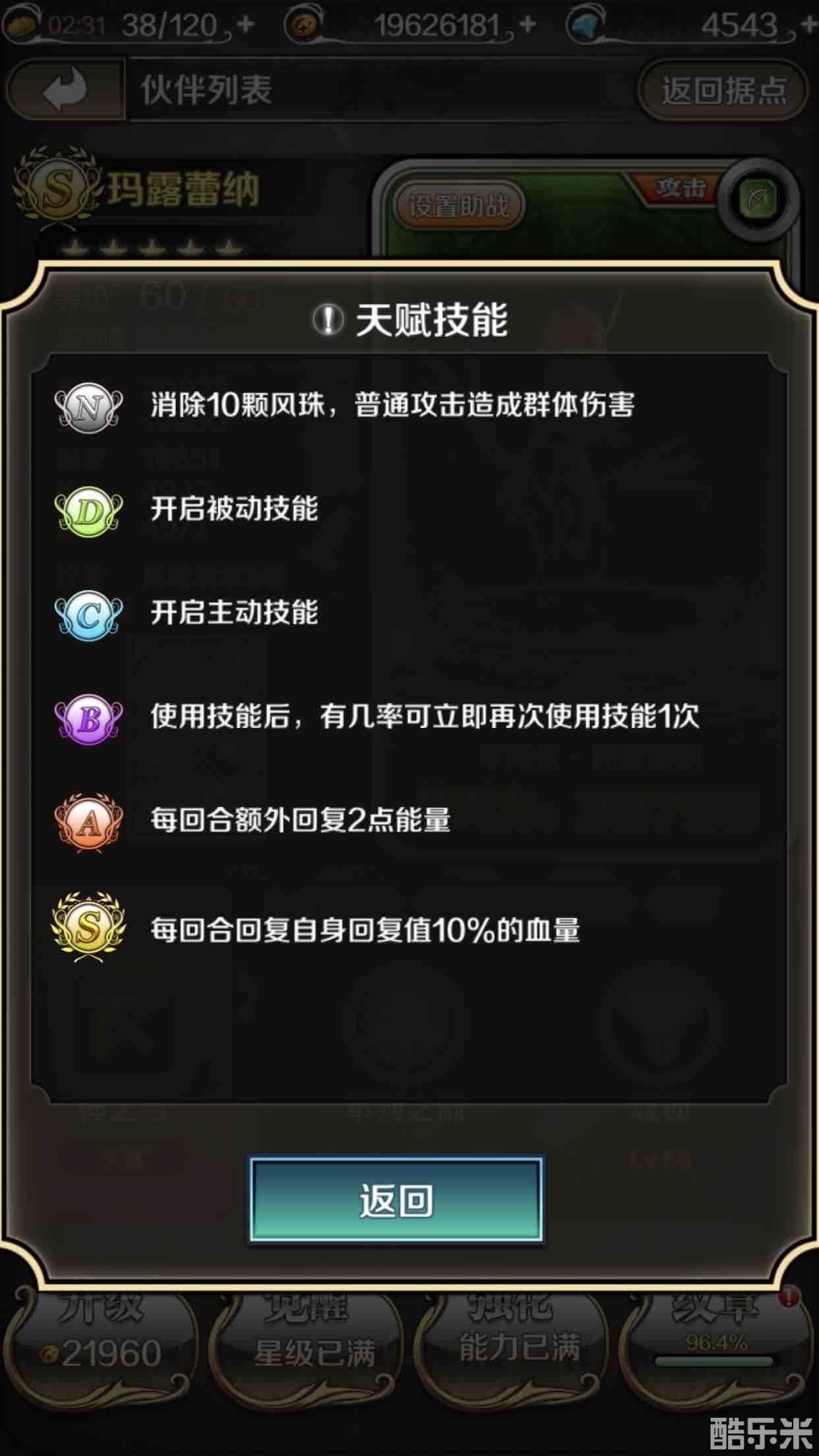 除了探索商店有出售她的碎片,第四个商店也有很小的几率刷新其碎片,不过这里我不推荐大家买,毕竟难出而且要80钻一片,对我这种v0玩家来说还是有点小贵,主要是能刷到的我为什么还要花钻去买呢,把省下的钻石用在更需要的地方不是收益更大吗?另外钻石招募里也有很小的几率可以抽到她的碎片,探索币较多的玩家也可以通过探索商店里买的招募券进行十连抽碰碰运气,就算没抽到风神碎片还是有几率抽到其他2星和3星人物滴。说穿了,只要你坚持,迟早就是可以拥有5星的玛露蕾纳滴,真的是非常平民化的橙色人物,基本人手都有,也算是游戏公司对于玩家的一大福利啦。接下来我们来看下她的属性和强化能力表。