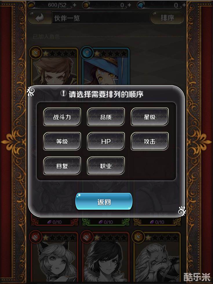 点击伙伴列表右上角的排序按钮,可选择角色列表的排序方式,排序方式有:战斗力、品质、星级、等级、伙伴HP、伙伴攻击力、伙伴回复值、伙伴职业;