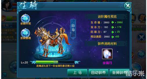 2、对坐骑进行进阶可以提升坐骑属性,进阶需要消耗一定的坐骑进阶丹