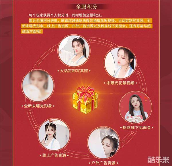 当每个玩家获得个人积分时,还会同时增加全服积分。累计全服积分进度,就能够解锁超越妹妹未曝光绝美花絮视频、大话定制写真照、全新未曝光形象、线上广告资源、户外广告资源以及粉丝线下见面会,还有可能与超越面对面哦!