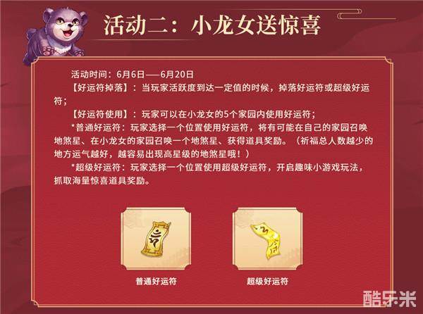 6月6日-6月20日,【小龙女送惊喜】活动同步开启,当玩家活跃度到达一定值的时候,系统将掉落好运符或超级好运符。玩家拾取好运符之后,可以在小龙女的5个家园内使用,玩家选择一个位置使用好运符,将有可能在自己的家园召唤地煞星、在小龙女的家园召唤一个地煞星、或者获得道具奖励。祈福总人数越少的地方运气越好,越容易出现高星级的地煞星,大家在使用好运符之前请仔细挑选场所哦!而当玩家选择一个位置使用超级好运符之后,将会开启趣味小游戏玩法,海量惊喜道具随你抓取!