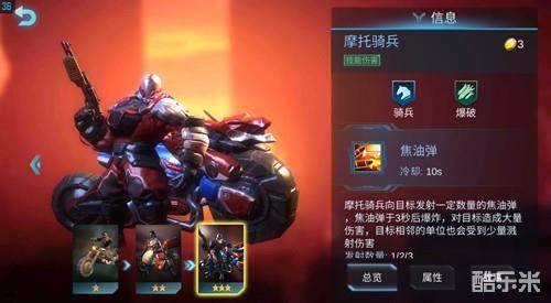 改版后的摩托骑兵个人感觉在前期效果平平,但在2星以后的表现却相当突出,经常一局战斗能够放出来两到三次大招,伤害非常可观!但由于不适合主流环境,所以不推荐三星,前期弄个两星过渡即可~