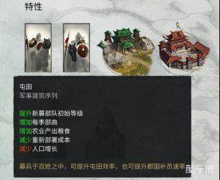 屯田代替募兵序列其他派系的募兵序列分3级效果是每季度驻守部曲增加2,重新部署成本减少5%(派系范围),新募部队等级+3(本地),屯田所分5级前3级效果跟普通派系的征募序列差不多,就是减少人口少一点,重点在后面2级从4级开始多了个产出粮食加25%的效果,5级产出粮食加50%,重新部署成本为8%,每季部曲也变成了3,人口减少为1.6w。这就体现了曹操的特色耕战:在农业城起军屯署随时都能低成本从全国拉兵出来也能帮助巩固城防。