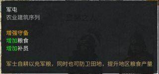 需要有农庄资源点才能把农庄替换为军屯,农庄的粮食产量为2,4,6,8,10。对应每1级军屯为2,3,4,6,8。每1级那么少的粮食换来了什么呢?2%,3%,5%,10%,15%的补员速率。所以一个有农庄的城对于曹操而言就是最好的军事基地。无论是前线防守战还是快速招兵都是很强的,再通过粮食进行外交才是曹操能一统北方的根本。