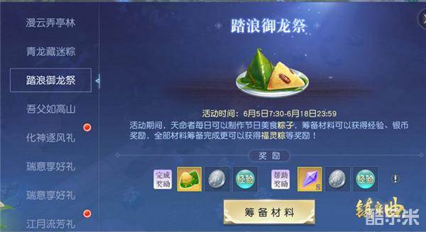 至6月18日止,天命者每日均可帮助中州百姓制作粽子,前往各地筹备所需材料。每份材料,均会折算为相应银币、经验以为答谢,若筹备完当天的材料,还可收获“福灵粽”等特殊礼物。这些材料有的寻常可见,有的获取较难,天命者们可向帮会其他成员求助或帮助其他人筹备材料,若获助完成亦有双方奖励送上。