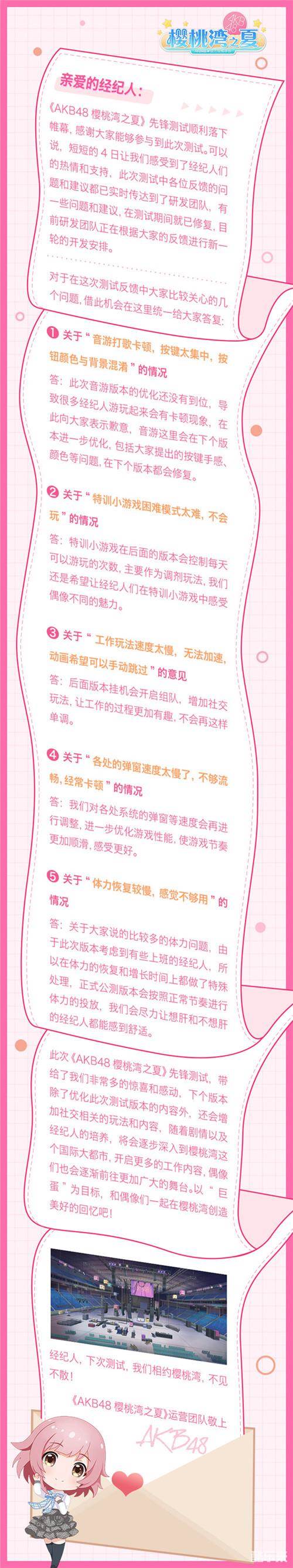 AKB48正版授权偶像养成手游《AKB48樱桃湾之夏》先锋测试日前完美落幕,官方也收到了数千条玩家的意见和反馈。今日,运营团队致谢各位“经纪人”,感谢大家对于先锋测试的支持,并对于大家集中关心的问题给予了答复,全文内容如下: