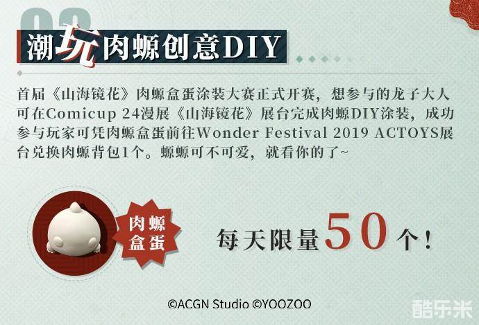 想要见到肉螈盒蛋实物,机会就在眼前!肉螈盒蛋将会首次亮相游族《山海镜花》Comicup 24展台,不过这次亮相的盒蛋实物并非“完全体”,需要大家亲自动手涂装。前往《山海镜花》展台更可以参与肉螈盒蛋涂装大赛,DIY自己的专属肉螈,限量50个的肉螈盒蛋等待着你的定制涂装。成功完成涂装的玩家可以前往WF2019的ACTOYS展台获得肉螈背包哦,肉螈盒蛋涂装后实物监修中版本也将在WF2019的ACTOYS展台进行展出,一睹实体化肉螈的好机会切勿错过!
