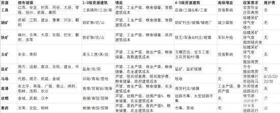 Tips:资源建筑一般分为5级,一般会附加4-5项增益(部分效果随建筑等级而提升)。其中前3级建筑无需求,4级和5级建筑需要政策解锁(也一般会比前3级建筑增加额外的属性条目增益),且4级和5级建筑可能有多种,不同种建筑一般解锁条件不同,增益效果也有差异(比如工具4级分为匠器库和工器库,5级分为匠器工室和工器工室。
