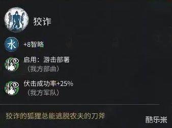 将领的加成一般分为军事类:统军加成(全军有效)、部曲加成(自己的部队有效)、单挑加成、冲阵加成、阵型加成。