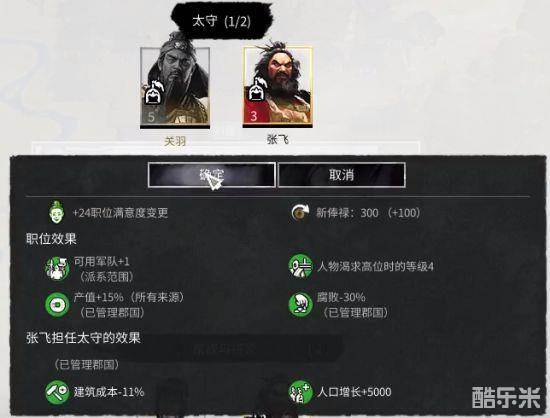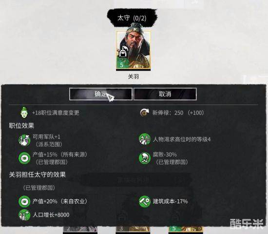 关羽是木系将领,擅单挑(技能大量增加伤害+溅射)、冲阵能力不错(近战引起敌军恐慌,降低士气)、擅统军。内政而言当农业郡太守也很不错(农业产值+20%、建筑成本-17%,人口增加+8000),刘备派系特色上来就开了太守位,是可以考虑上来让关羽当东郡或者琅琊太守稳住钱粮收益的。