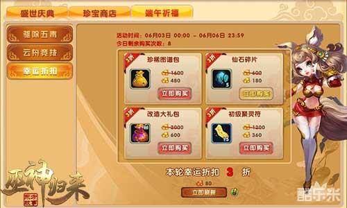 端午节期间,还有超值优惠的折扣活动等你参加,在幸运折扣的活动中,道具种类和折扣力度将在1.5折到8折之间随机刷新。无论是珍稀图谱包还是仙石碎片,赶紧上线瞅一眼有没有你急需的。