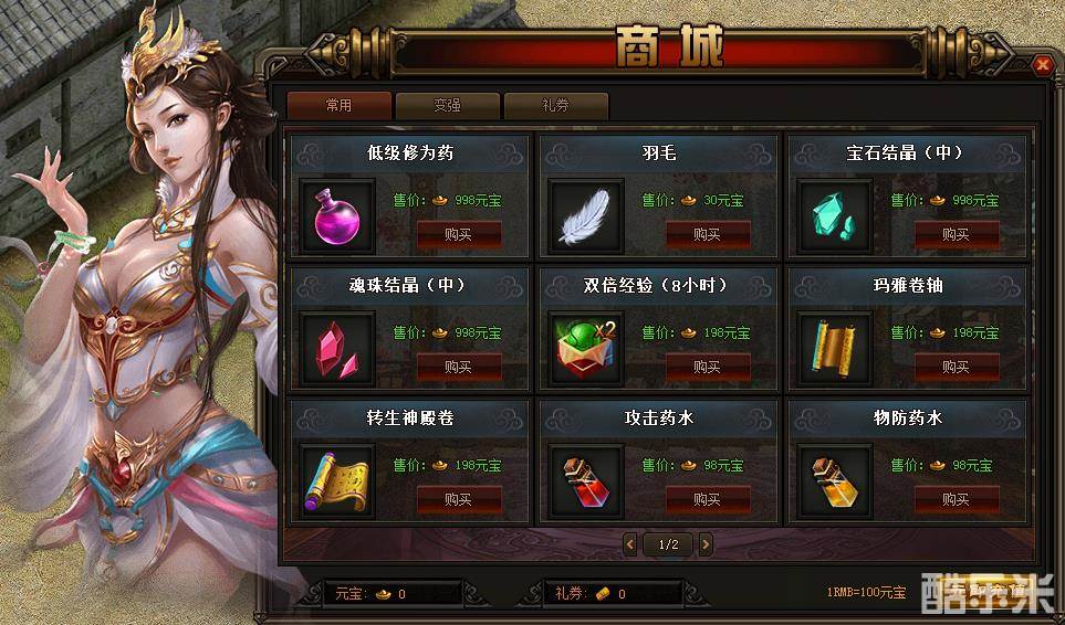 “常用”、“变强”页签下的道具需要用元宝购买,而“礼券”区域的道具则需要用礼券购买。