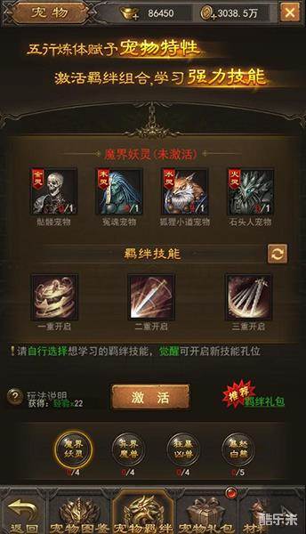 游戏中,玩家任意角色达到二次涅槃,即可开启宠物羁绊;通过收集对应五行特性的宠物,即可激活相应宠物羁绊组合,宠物羁绊组合激活后,可学习羁绊技能;