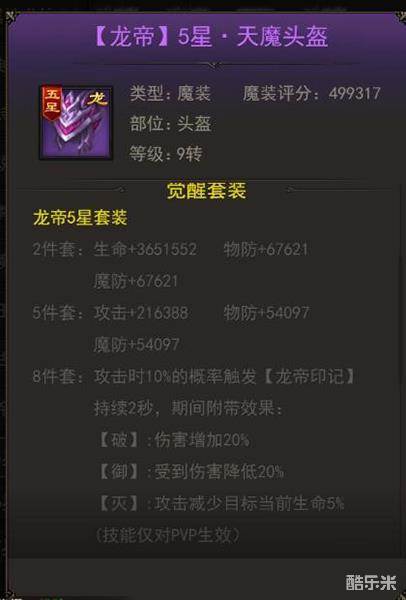 天魔追魂,龙帝为尊,玩家在游戏中完成“天魔觉醒”,即5星及以上的基础魔装可进行魔装觉醒。通过小号不同的觉醒石来觉醒“星王”“上古”“龙帝”三大套装。魔装觉醒后,可增加大量基础属性,激活达到8件套更能掌握套装技能,拥有强大的印记效果,包括增加伤害系数、受到伤害降低、攻击减少目标当前生命百分比等效果