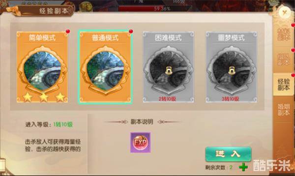 初期跟着主线任务走,很轻松就可以达到开启经验副本的等级,经验副本每天可以进入次数有限,通过提升VIP等级可以增加购买副本次数,每次进入都要消耗次数。