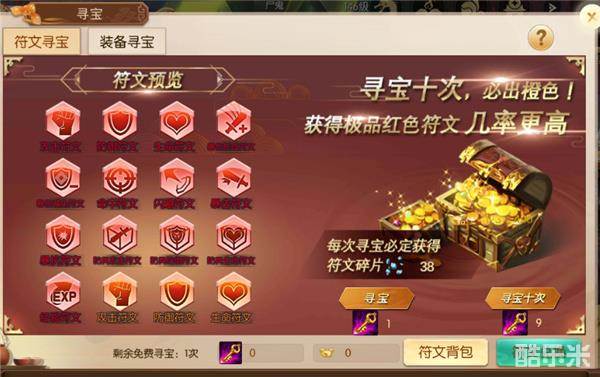 这个界面用元宝进行单次寻宝或者十连抽寻宝,每天都有一次免费的单次寻宝的机会,符文寻宝是获得高级符文的途径之一,每天都有一次免费的单次寻宝的机会。