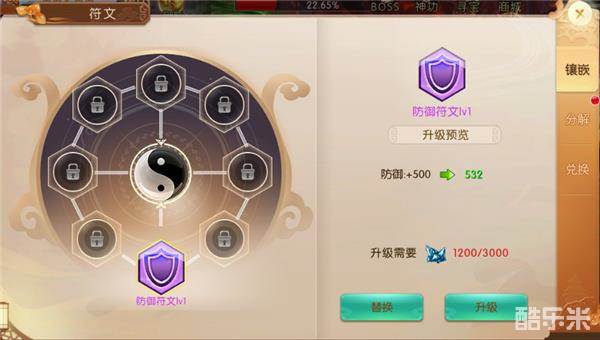 符文的镶嵌需要通关深渊荡魔关卡,通关的层数越高,可以镶嵌的符文数量也就越多。同时镶嵌之后的符文还能通过符文精华来进行升级,升级之后属性也会随之提高。