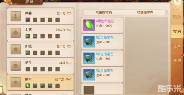 宝石镶嵌,提升战力,每件装备有五个宝石孔,对应三种类型的宝石,每个孔可镶嵌一颗宝石;随装备强化等级开放宝石孔;宝石镶嵌后可获得属性加成;宝石套装到一定条件有额外属性加成。