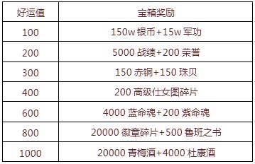 【活动内容】活动期间,每消费1000金币,即可获得100好运值,累计获得好运值可开启奖励宝箱。