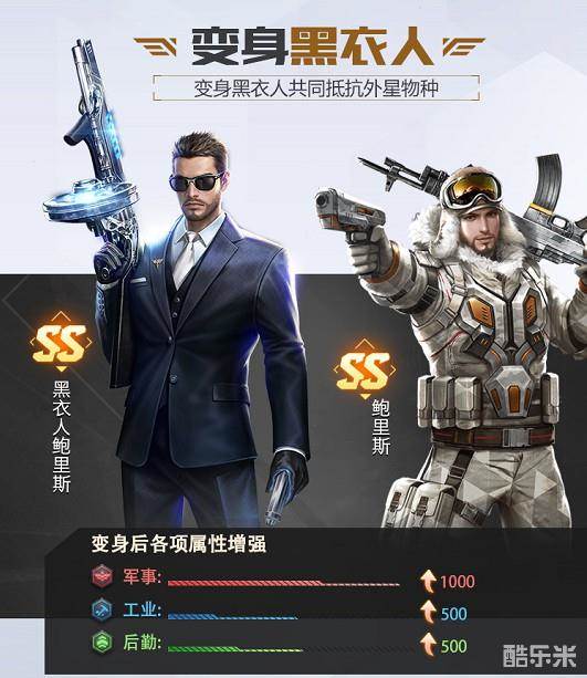 拥有黑衣人皮肤后,变身黑衣人的鲍里斯/谭雅将获得对应的数值加成。其中,军事加成+1000,工业加成+500,后勤加成+500。