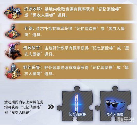 1、资源收取:基地内收取资源有概率获取“记忆消除棒”或“黑衣人墨镜”道具。