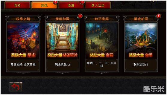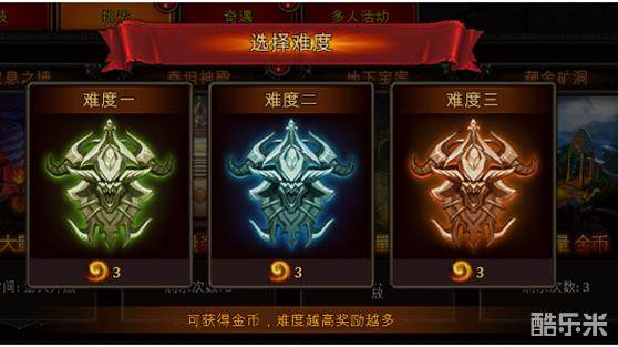 藏金矿洞——游戏里不花钻石就能获得金币的大头,单靠每天刷副本所获得的金币是远远不够,所以每天3次的藏金矿洞也是一定要打完的,同样也是三种难度,难度越高获取的金币越多。