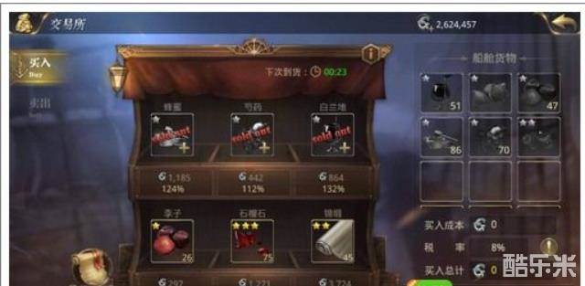 首先需要到达一个港口,在港口中找到交易所,进入交易所后可以看到交易所出售的各类商品,购买商品的时候可以选择定量购买或者最大量购买,购买商品的时候最好购买120%以下的商品,出售的时候最好在80%以上的时候出售。