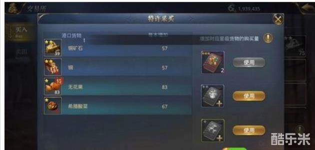 购买货物可以使用特许购买,特许购买能够增加购买货物的数量,特许购买需要消耗特许采购书,不同的采购书影响不同的货物采购,采购书主要来自商城、商会贡献、竞技积分、每周限购。