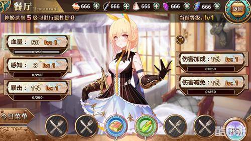 卡牌修复疲劳值之后,可带小姐姐们前往“餐厅”,卡牌需要达到5级才可以进入餐厅进行喂食,喂食可以提高被投喂卡牌血量,感知,暴击,伤害加成,伤害减免等5个维度的数值。